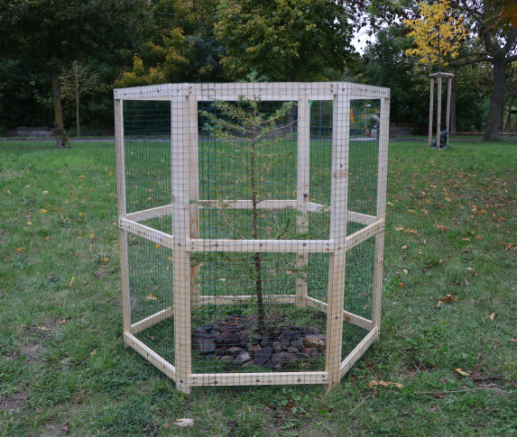 Der Käfig, der den Baum vor Stürmen und Verbiss durch Wildtiere schützen soll, wurde über Nacht von Unbekannten entwendet. Der Baum selbst wurde zum Glück nicht beschädigt. Aber es musste Material gekauft und ein neuer Käfig gebaut werden.