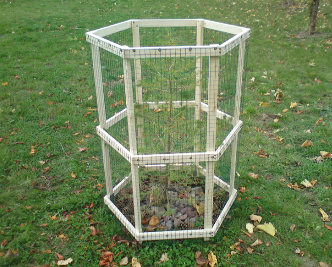 Zum Schutz gegen starken Wind und Fraßschäden wurde das Bäumchen in einen Käfig gestellt. Die Zapfen am Boden beschatten den Wurzelbereich und sind ein sehr zuverlässiger Feuchtigkeitsanzeiger.